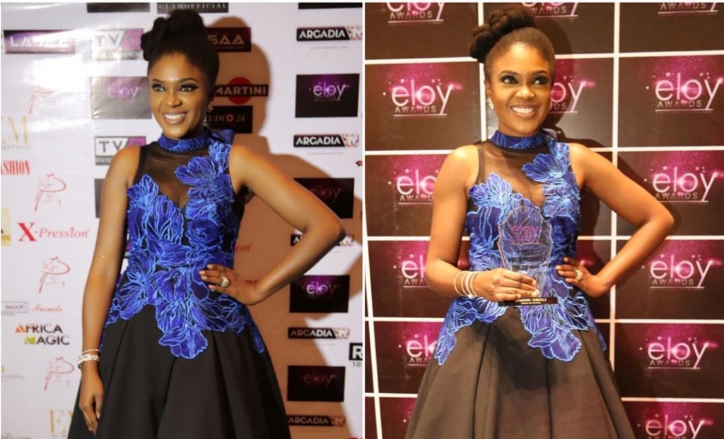 Beautiful Nollywood sensation, Omoni Oboli looks dashing in her blue and black lacey gown made by Ejiro Amos Tafiri. She wore this outfit to the Eloy Awards, where she bagged an award as the Best Female Producer for her film- Wives on Strike.
