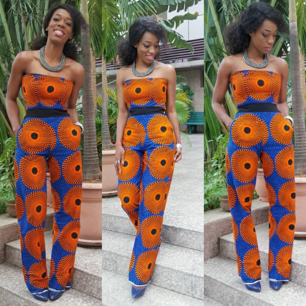 Today, Amaka is our look of the day, as she rocks a strapless Ankara jumpsuit. The Palazzo cut of the outfit gave her a flattering fit, as she accessorized with a bold neck-piece, bracelet and rings.
