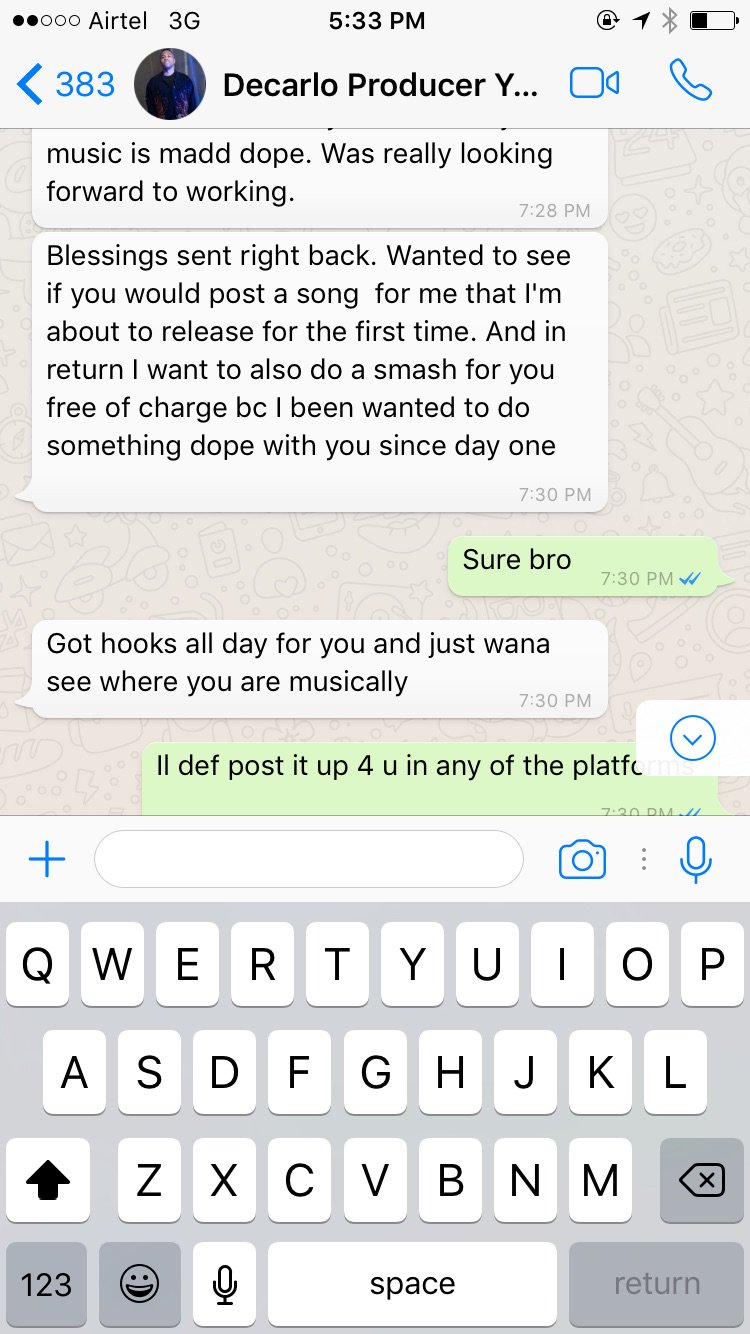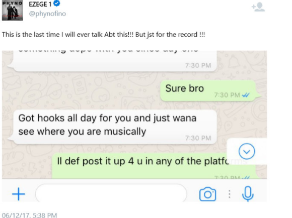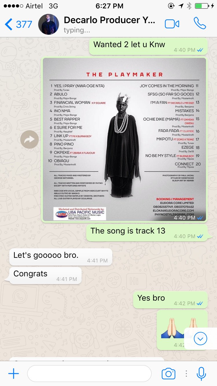 Serving it whilst hot, Phyno responded and shared screenshots of his conversation with Decarlo, giving him right to use the song.