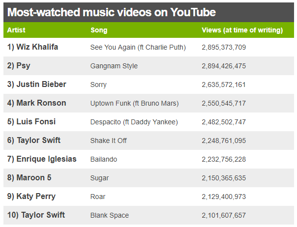 Wiz Khalifa and Charlie Puth’s See You Again heart-wrenching ballad sit at the top of the chart now as it has been streamed 2,895,373,709 times; beating Psy’s current count of 2,894,426,475 views.