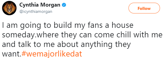 Dancehall musician, Cynthia Ikponmwenosa Morgan, popularly called by her stage name Cynthia Morgan seems to be committed to her loyal fans as she revealed her plans to build them a house someday.