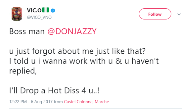 Vic O took to his Twitter page to issue this warning, while tagging the Mavin’s boss. He added that Don Jazzy had refused to acknowledge his request to work with him.