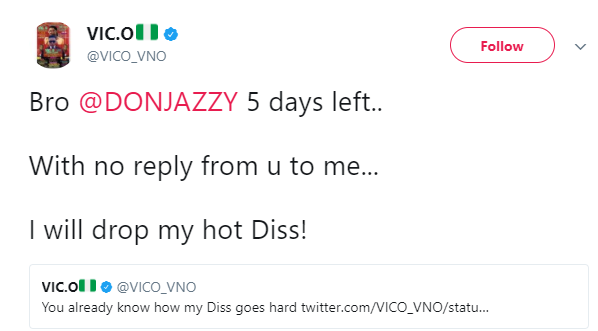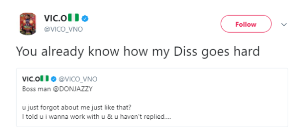 Vic O took to his Twitter page to issue this warning, while tagging the Mavin’s boss. He added that Don Jazzy had refused to acknowledge his request to work with him.