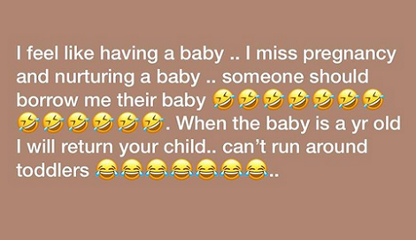 In her post on social media, she talked about how she misses having babies and carrying out mother duties.