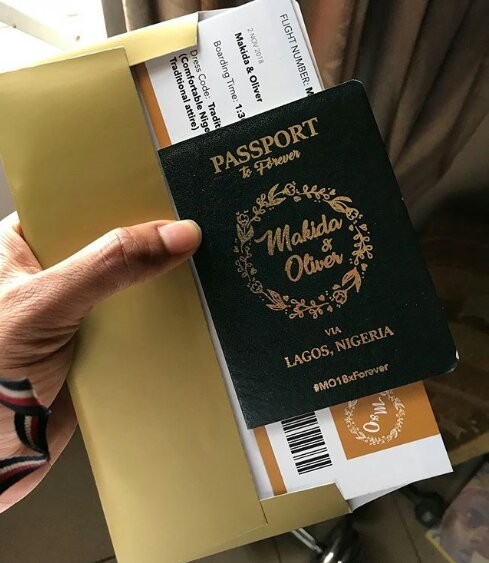 The invitation is like the Nigerian passport with what looks like a flight ticket but with details about the wedding.