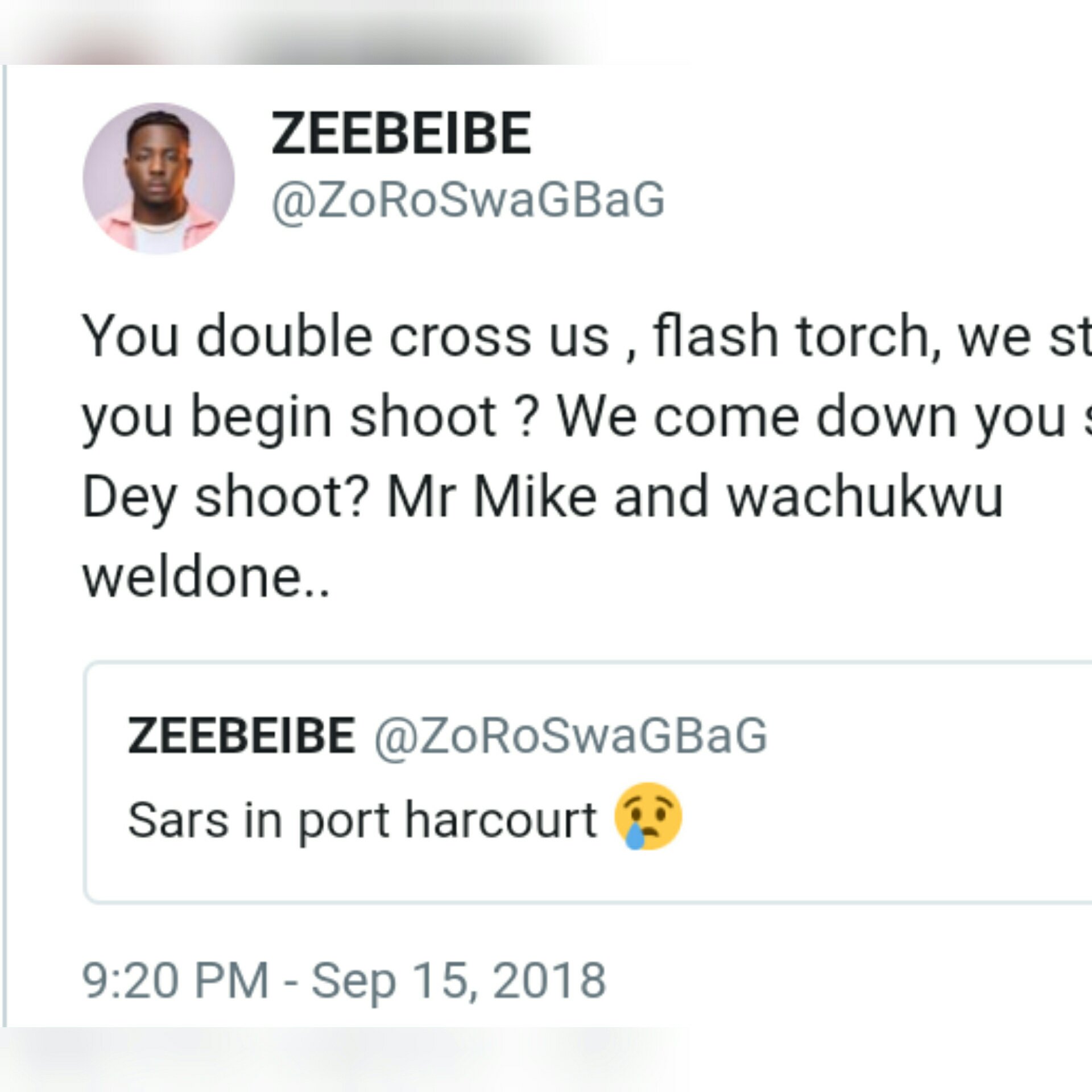 “SARS in Port Harcourt. You double-cross us, flash torch, we stop, you begin shoot? We come down you still Dey shoot? Mr Mike and wachukwu weldone..”