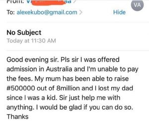 “Father Lord you that parted the Red sea, & led the Israelites out of danger, pls give me this money pple think i have… the Heart is willing but the bank akant is weak. ? See this bros is asking small me to sponsor him to study “in the abroad” a whooooooole Australia, kai bros u get mind, you no even talk Unilag or Lasu or even our backyard Cotonou, there is even no direct flight to Australia from Nigeria, & you’re asking me to raise 7.5 MILLION NAIRA ??? Dear Nigerians pls if you are begging for help pls beg with conscience & fear of God, both my younger ones are studying in Nigeria here, me that studied in UniCal i’m not mad, & i did not die.