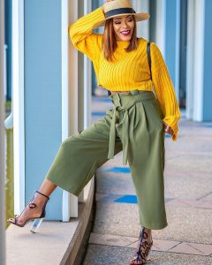 Style blogger, Fashionably Idu is BAE i.e. Beautiful, Alluring and Elegant in this yellow top paired with navy green pants.