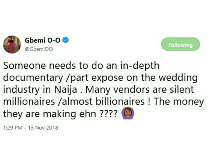 Gbemi said an indepth documentary on the wedding industry in Nigeria needs to be done with a view of showing how profitable it is to be a wedding vendor or planner in Nigeria.