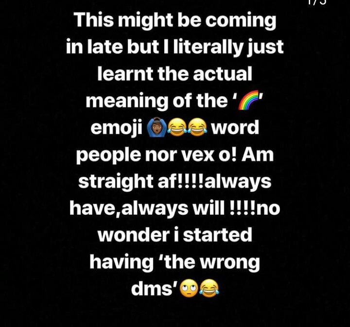 “Shoutout to @queenviee @jaymoneyentt @nevadabridgepro @mofedamijo for the knowledge.So I would naturally not say but i feel at the end of the day we as human beings learn on a daily basis and with the platform I have,would be nice to impact same knowledge to my lovely followers that don’t know so they won’t make same mistake. DONT GET IT TWISTED M NOT TRYING TO PROVE A POINT TO NOBODY COS I DONT GIVE A F**K!!!For those who don’t know (even tho in my context I was obviously referring to the actual weather)this is for you:The ? emoji is ALSO a symbol for the ‘LBGT’ movement (lesbian,gay,bisexual,transgender)Fortunately or unfortunately for y’all I AM NONE OF THE ABOVE!!!!…check my records?Am only explaining for those that didn’t know till today like me.So please stop having my dm’s adulterated(you know yourselves!?And bout my piercings…hey they are just 4years old and am only on the 7th one..” He wrote.