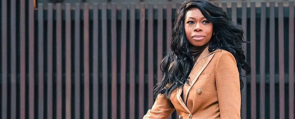 She is sending out #BossLady vibes dressed in her brown power suit paired with a darker brown turtle neck top.