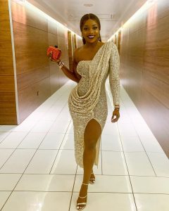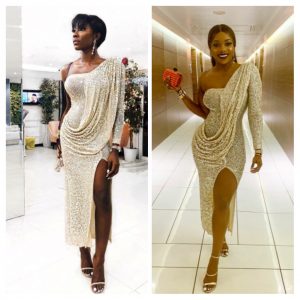 These two beautiful ladies, business enterpreneur, Chioma Good hair and Fashion designer, Og Okonkwo look smashing in this lovely thigh slit shimmering gown.