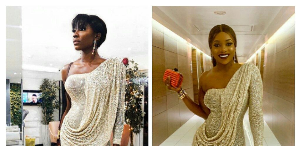 These two beautiful ladies, business enterpreneur, Chioma Good hair and Fashion designer, Og Okonkwo look smashing in this lovely thigh slit shimmering gown.