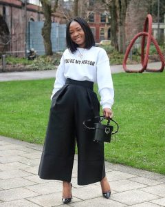 Indeed, Style blogger, Damilola-@edaowofashion is our personal person in the lovely white sweatshirt of hers which she pairs with nice flared trousers.