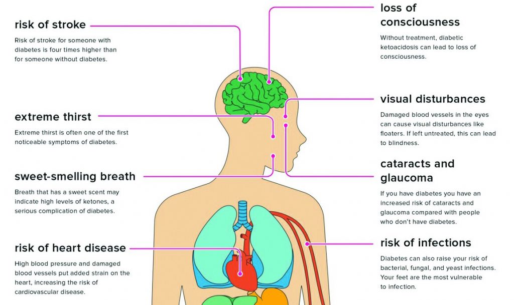 Diabetes type 2 if left untreated can lead to many issues including heart disease, stroke, foot problems, and kidney damage and nerve pain.