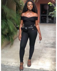 Nollywood actress, Linda Osifo is the mystery lady in this black off-shoulder top paired with black trousers.