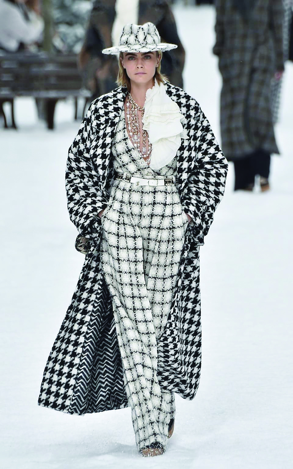 Chanel wowed at the Paris Fashion Week A/W 2019, in a layered checks and dogtooth prints. The look featured a wide leg jumpsuit and oversized tweed coat with a clashing printed hat. It’s a must-have for the season.