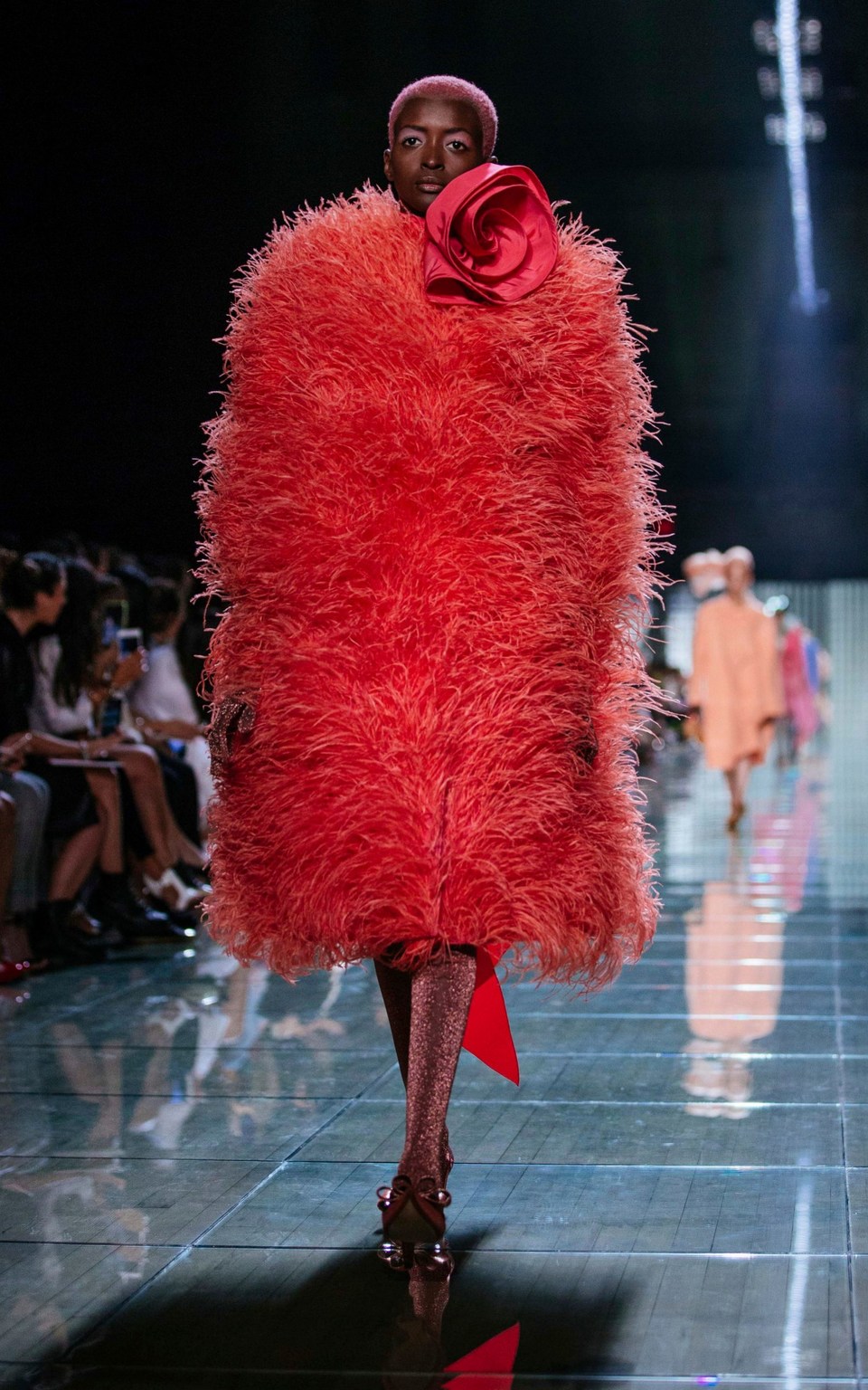 Mac Jacob’s showed an array of bright colours, standing out with a red feathered coat with giant corsege.