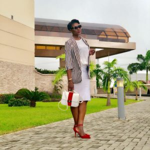 Lo and behold! Nollywood actress, Ufuoma McDermott, who is our look of the day, in this lovely stripped blazers matched with white top and white skirt.