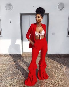 Who’s that girl? It is none other than fashion designer, Olar Slim. Bold and daring, she steps out in this red blazers on floor-length red trousers with frills. For the edgy effect, she shows off a generous amount of cleavage in an inner tube.