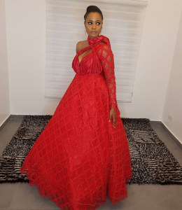 Ini Edo’s curvy figure was out to play in this wavy, gorgeous red gown. Ini made her gown the center of attention with very ltitle accessories. This is a choice outfit for any glamorous event.
