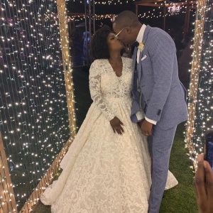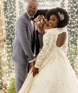 The bride and the groom just as well looked lovely. While Temidayo rocked a flowing, lacy gown, her husband wore a white and black suit.