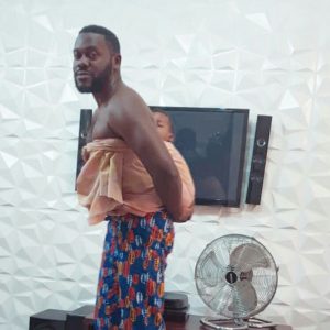 Actor, Deyemi Okanlawon certainly knows how to do daddy duties very well. The actor proved that what a woman can do, a man can also., when he strapped his baby at his back.