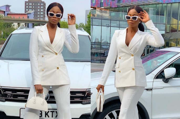 On the streets of London, Afegbai who is an embodiment of confidence showed how stylish a white pant suit can look on a good day.