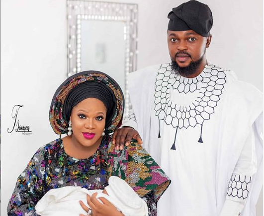 Nollywood actress and producer, Toyin Abraham has shared an adorable family photo, where she posed carrying her newborn son, Ire. Her husband, Kolawole Ajeyemi was not left out.