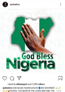 on her Instagram handle, she wrote, God bless Nigeria! No shaking. Daniel has been in the lions Den and the lord shut the lions mouth. A new great nation shall arise where love, truth, justice guide. Our banner, freedom, flutters on. Oh Lord, thy will be done.
