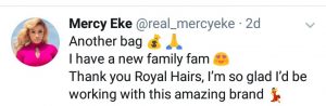 Mercy Eke has signed endorsement deals with Moetchandor and Royal hair. These she made know through her Twitter handle.