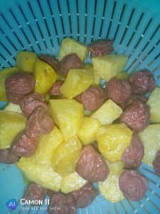 Heat vegetable oil to deep fry the half done Potatoes with sausages. Fry until it turns golden yellow. Then drain in a sieve.