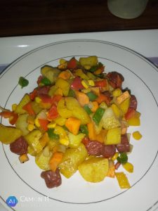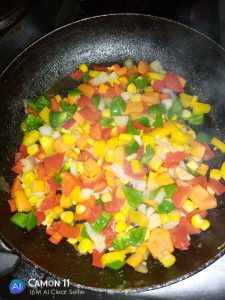 In a different pan, non stick pan preferably, put one table spoon of vegetable oil, add chopped onions, chopped garlic, chopped green, red and yellow bell peppers, add chopped carrots, sweet corn and stir. Sprinkle pinch of seasoning cubes. When the veggies are half cooked add the potatoes and sausages and serve.