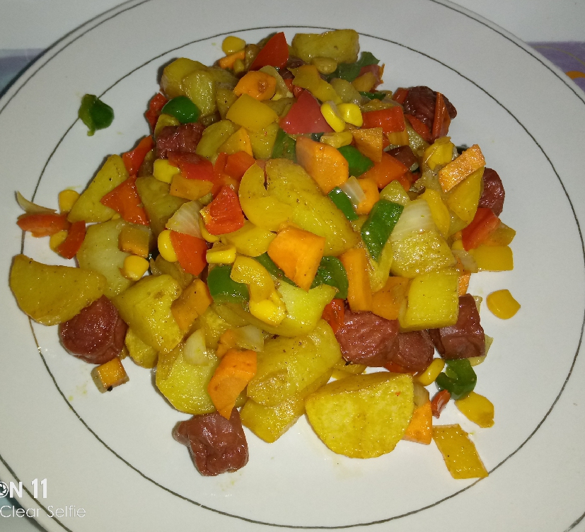 In a different pan, non stick pan preferably, put one table spoon of vegetable oil, add chopped onions, chopped garlic, chopped green, red and yellow bell peppers, add chopped carrots, sweet corn and stir. Sprinkle pinch of seasoning cubes. When the veggies are half cooked add the potatoes and sausages and serve.