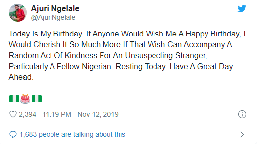 Special Assistant to President Muhammadu Buhari on Public Affairs, Ajuri Ngelale, has requested for random act of kindness from his fans to strangers as a way to mark his birthday.