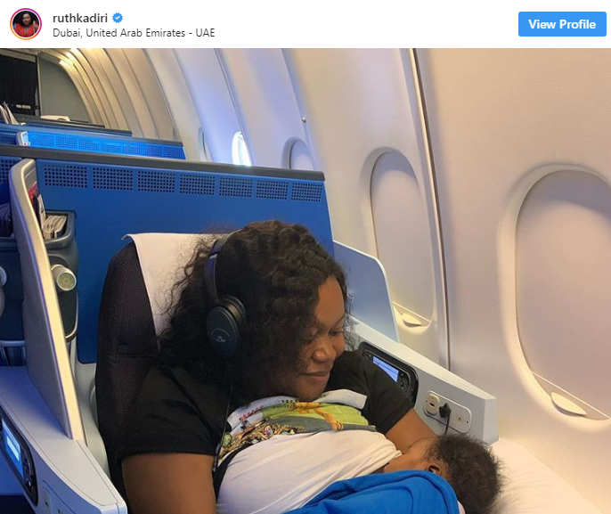 Actress, Ruth Kadiri, on Saturday shared a picture of her breastfeeding her baby daughter aboard a flight to the United Arab Emirates.