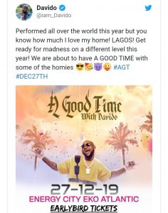 Announcing the concert, Davido stated that, although the year has been a great one for him, due to his performances in countries across the world, he won’t be leaving Lagos out of his 2019 showbiz list.