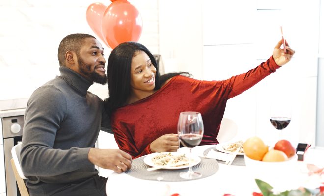 Portrait of a romantic happy young African American couple enjoying