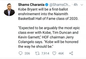 “Expected to be arguably the most epic class ever with Kobe, Tim Duncan and Kevin Garnett,” HOF chairman Jerry Colangelo says. “Kobe will be honored the way he should be.”