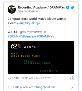 She was announced the winner of the ‘Best World Music Album’ category at the the 62nd Grammy awards, held at the Staples Centre in Los Angeles, in the early hours of Monday