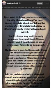 “You ALL know that I just proposed to Chioma recently and it would make no sense whatsoever for me to be doing such. My daughter’s mother had her business in Ghana with Afrochella selling Imade’s hair products at stalls and I was obviously booked to perform at Afronation.