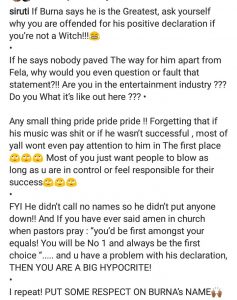 If Burna says he is the Greatest, ask yourself why you are offended for his positive declaration if you’re not a Witch!!!