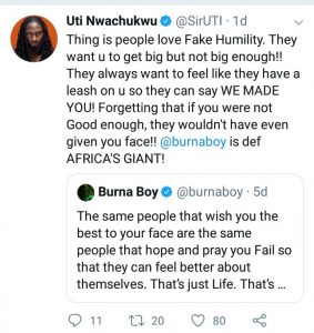 Uti in defense believes its hypocrisy for anyone to call Burna Boy proud for his positive declaration.