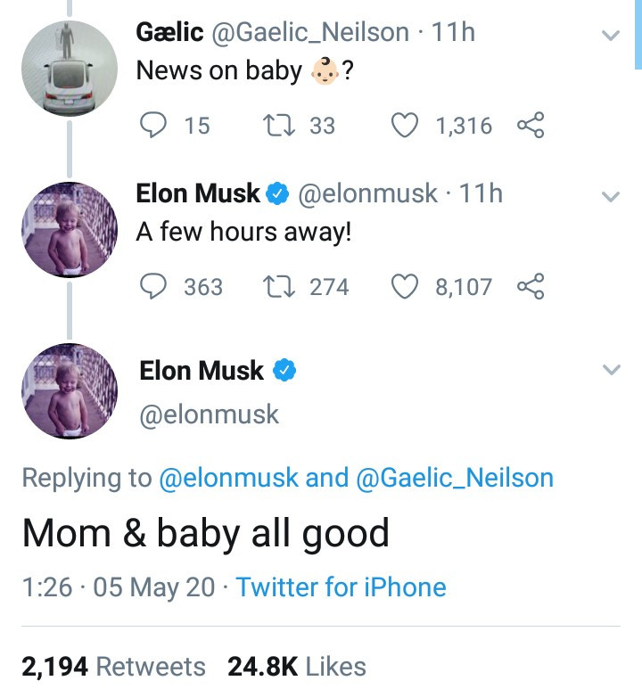 Elon announced the birth of his son via Twitter at the early hours of today 5th May.