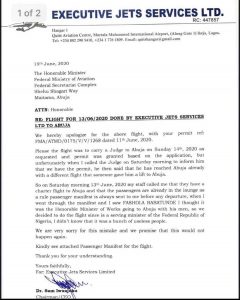 Please the flight was to carry a Judge to Abuja on Sunday 14′, 2020 as requested and permit was granted based on the application, but unfortunately when I called the Judge on Saturday morning to inform him that we have the permit, he then said that he has reached Abuja already with a different flight that someone gave him a lift to Abuja.