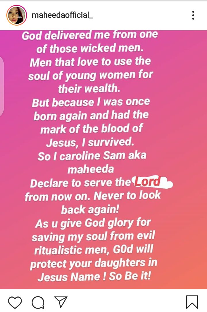 In a recent post revealed that she has decided to serve God after He delivered her from the hands of evil men who use soul of young women for wealth.