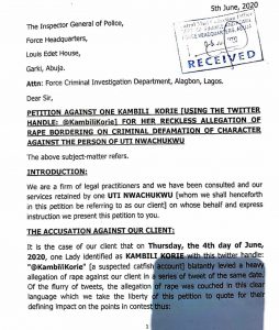 Popular TV presenter, Uti Nwachukwu has filed a petition to the Inspector General of Police, demanding a full-scale investigation into an allegation of rape leveled against him on social media by a lady identified as Kambili Korie.