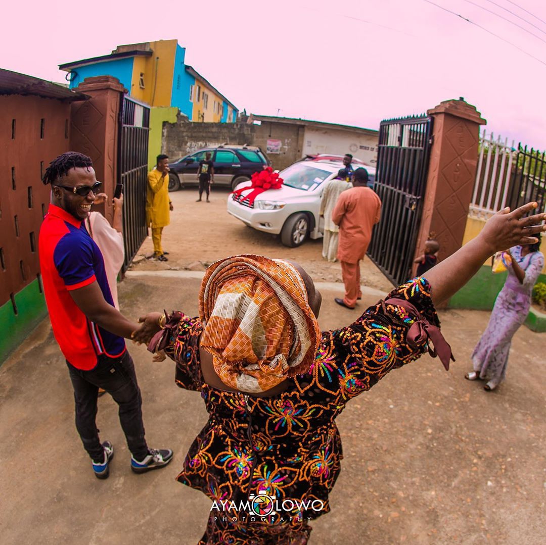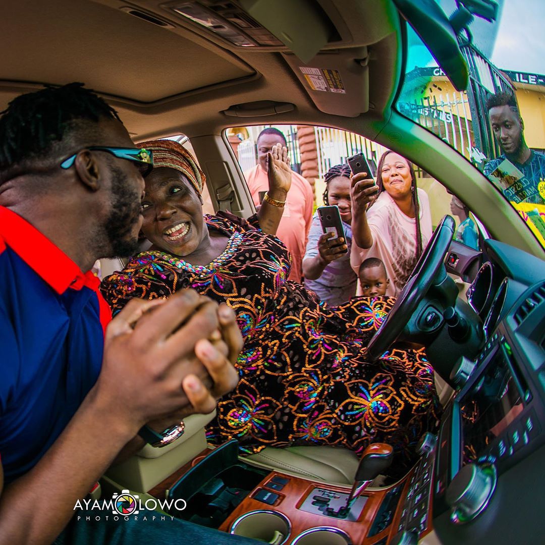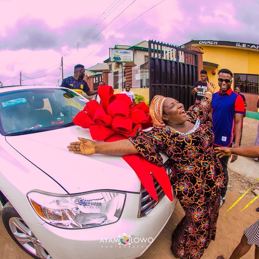 Taking to Instagram, Kaywise posted photos of himself presenting the car to his mother and captioned;