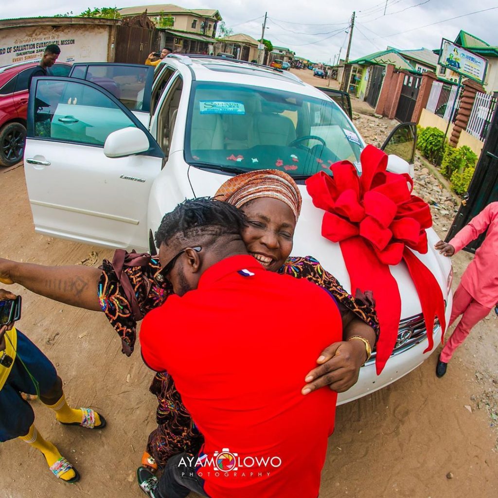 Taking to Instagram, Kaywise posted photos of himself presenting the car to his mother and captioned;