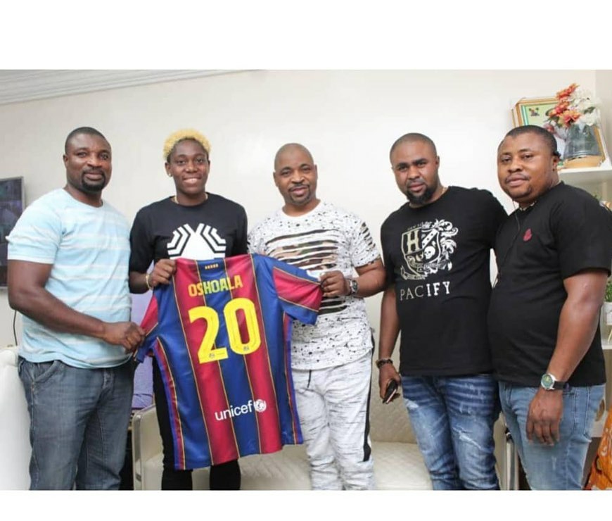 The Nigerian professional footballer who plays for Spanish side FC Barcelona Femení in the Primera División as a forward, also paid a courtesy visit the royal Oba Saheed Ademola Elegushi (Kusenla III) of Ikate-Elegushi, few days ago.